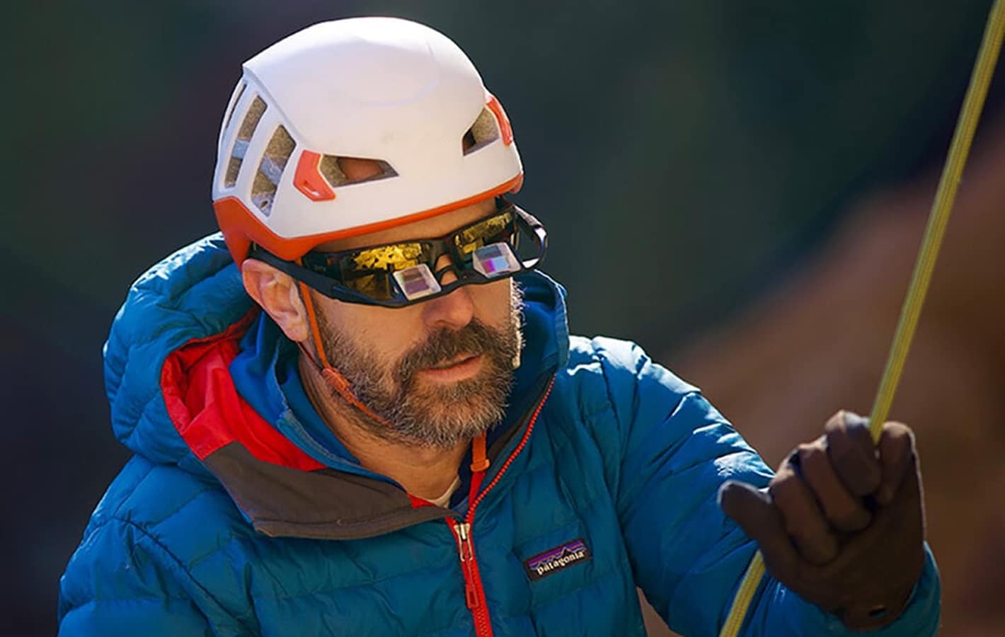 Ability to wear over prescription glasses or sunglasses, with dual field of vision allowing simultaneous monitoring of climber and belay device.