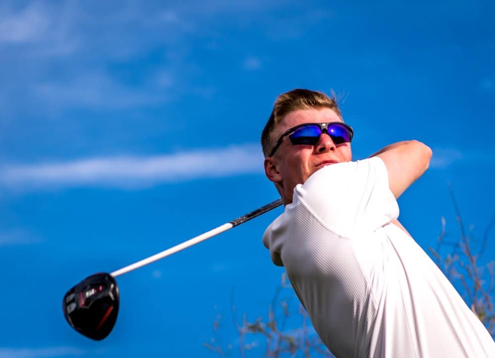 These sunglasses feature polarized lenses to reduce glare from water hazards and sand traps, while maintaining color contrast for better depth perception. Many models also include impact-resistant materials for durability during active play.